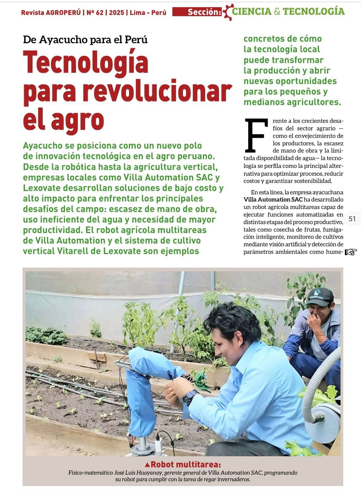 El trabajo de Villa Automation SAC ha sido destacado a nivel nacional en la Revista AGROPERÚ – Sección Ciencia & Tecnología (Edición 2025), como un ejemplo de cómo la tecnología desarrollada en regiones puede transformar el agro peruano y generar nuevas oportunidades para pequeños y medianos productores. La publicación resalta el desarrollo de un robot agrícola multitarea, creado en Ayacucho, capaz de ejecutar procesos automatizados como riego inteligente, fumigación, monitoreo de cultivos y detección de variables ambientales, integrando robótica, control automático e inteligencia artificial.